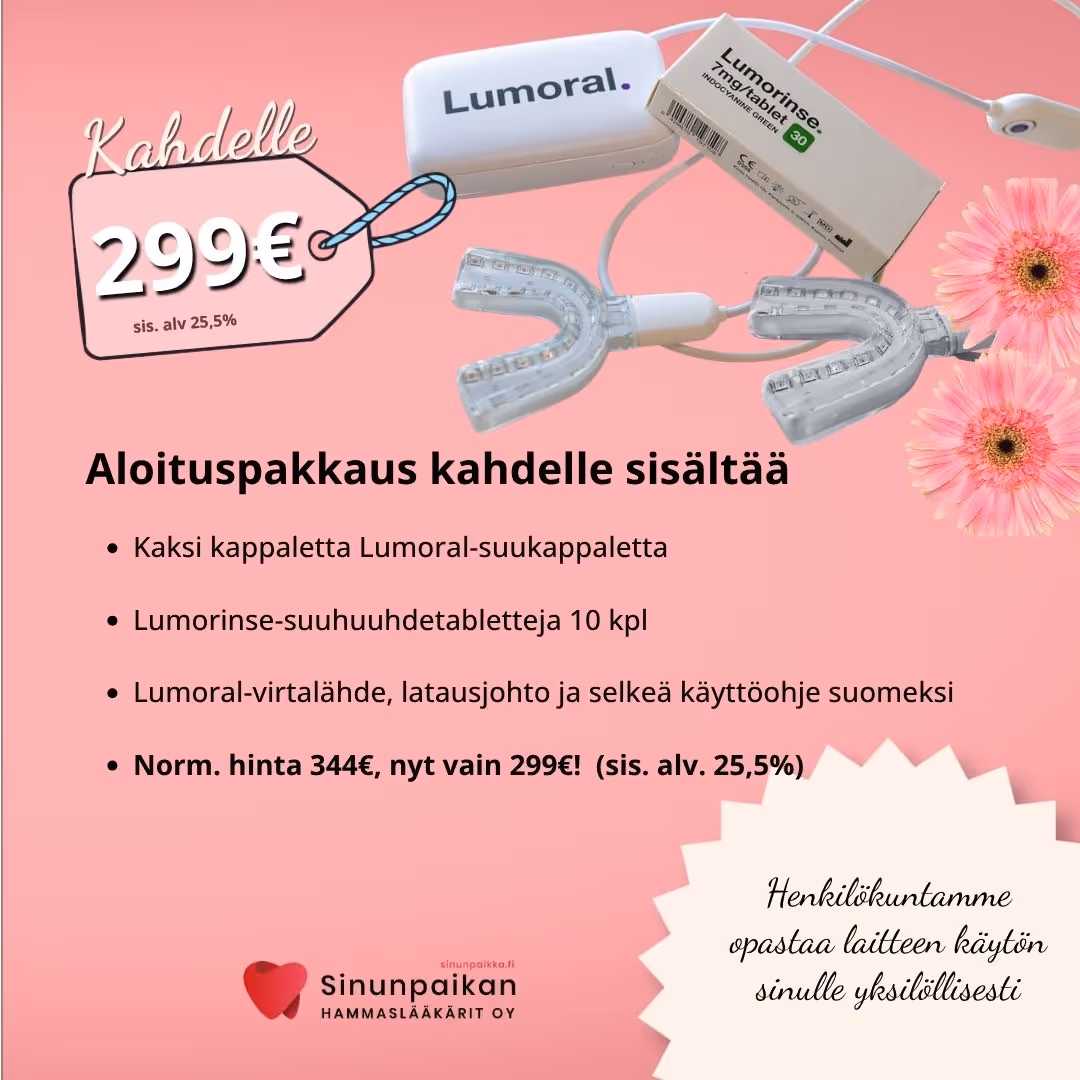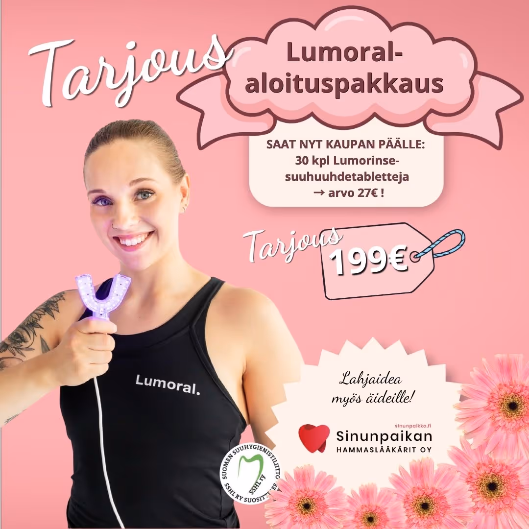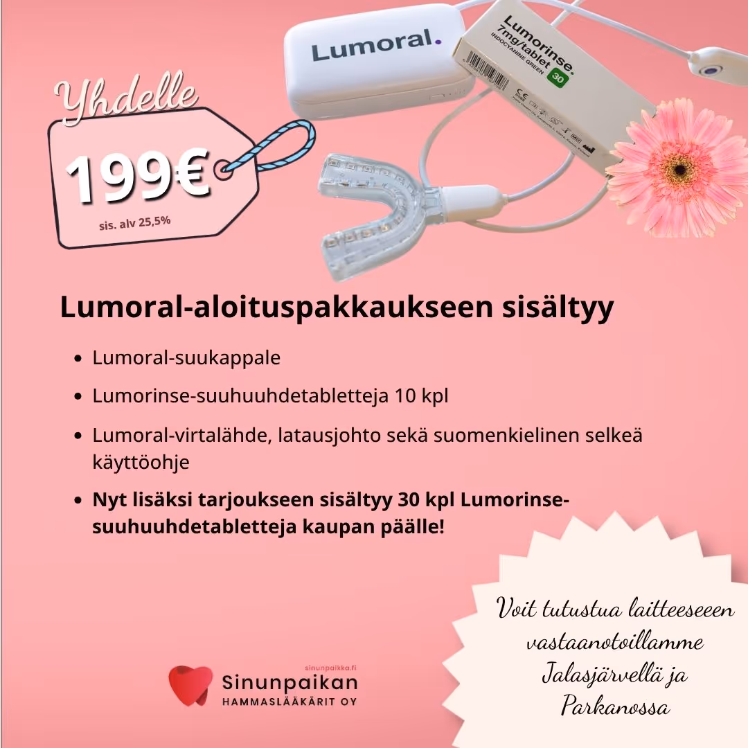 Lumoral-laitteen aloituspakkaus nyt tarjoushintaan 199€! Saat kaupan päälle lisäksi 30 kpl Lumorinse-suuhuuhdetabletteja (arvo 27€). Aloituspakkaukseen sisältyy Lumoral-suukappale, 10 kpl Lumorinse-suuhuhdetabletteja (sekä nyt tarjouksen etu +30 kpl), virtalähde, latausjohto sekä selkeä suomenkielinen käyttöohje.